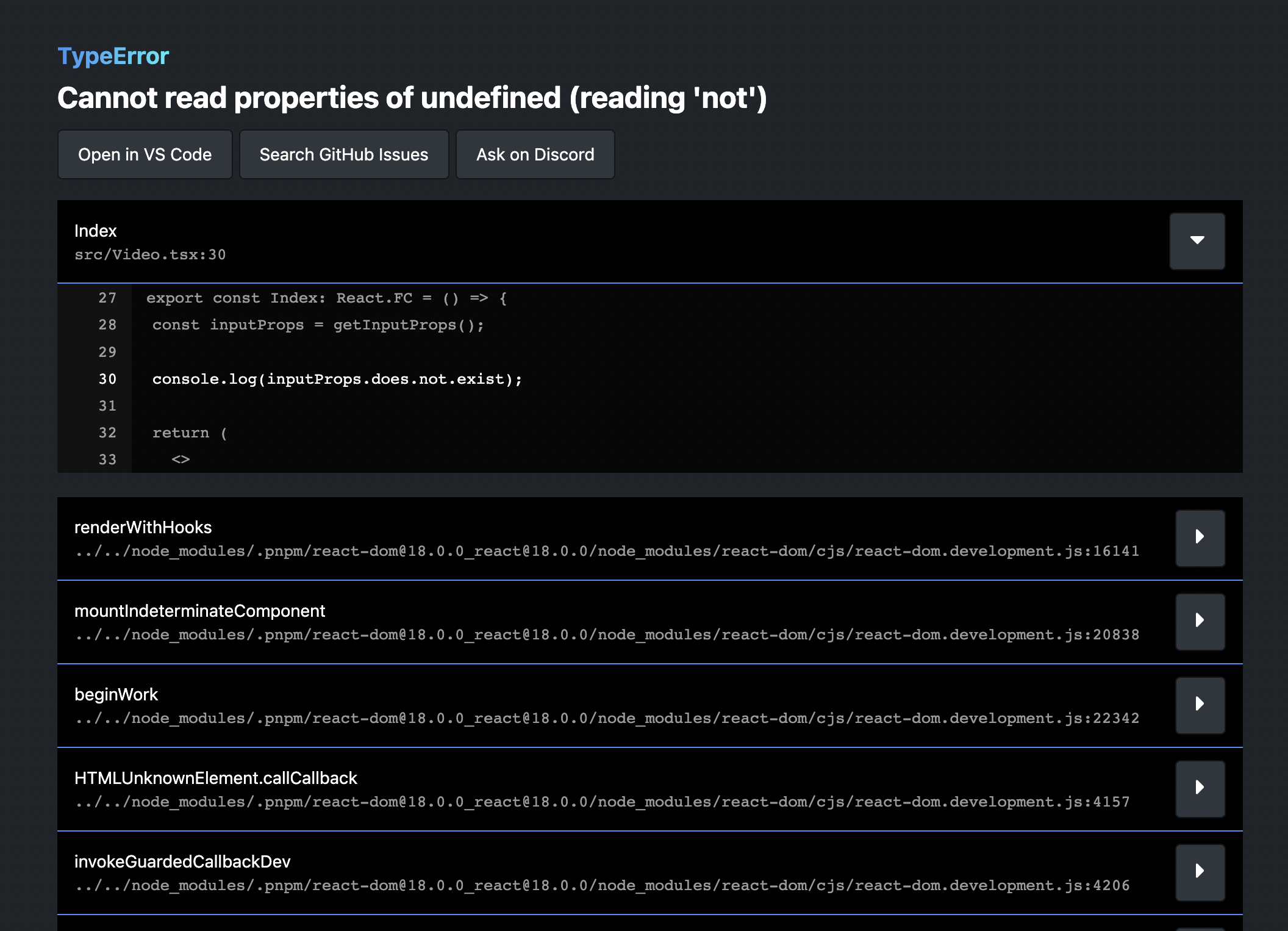 The Fast Refresh and error overlay is now inlined in our codebase and allows for customization that makes sense for Remotion. The overlay now matches the dark theme of the Remotion Preview and includes handy links such as opening a file in the editor, looking for the error in our GitHub issues and our Discord community.